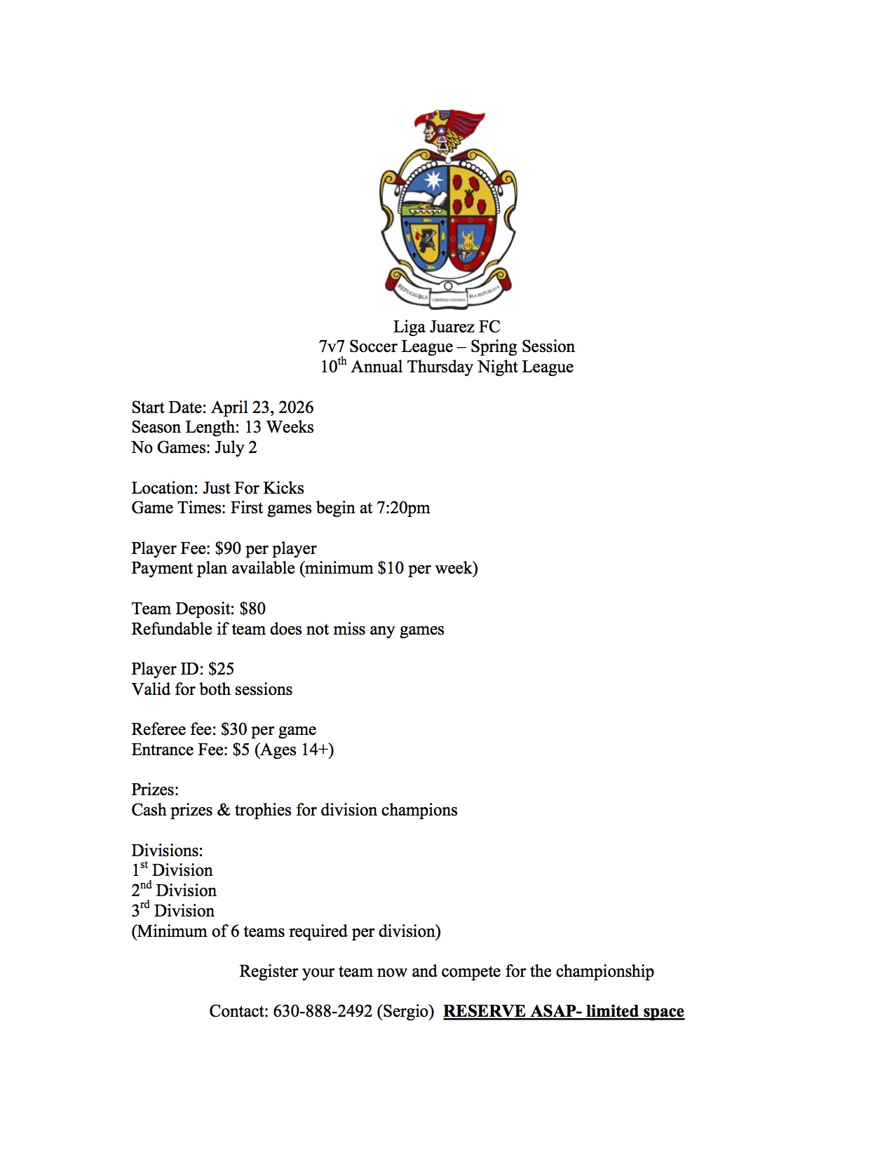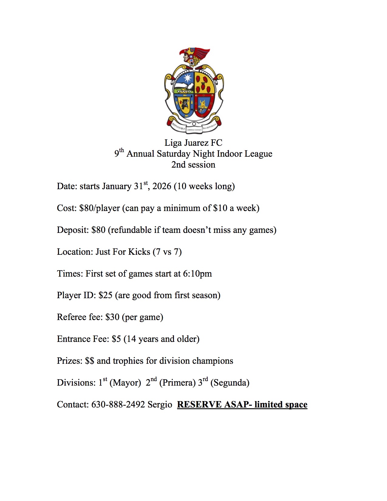 Liga Juarez FC offers men's leagues at Just For Kicks. Please call or text Sergio Rodriguez for information: 630-888-2492.
